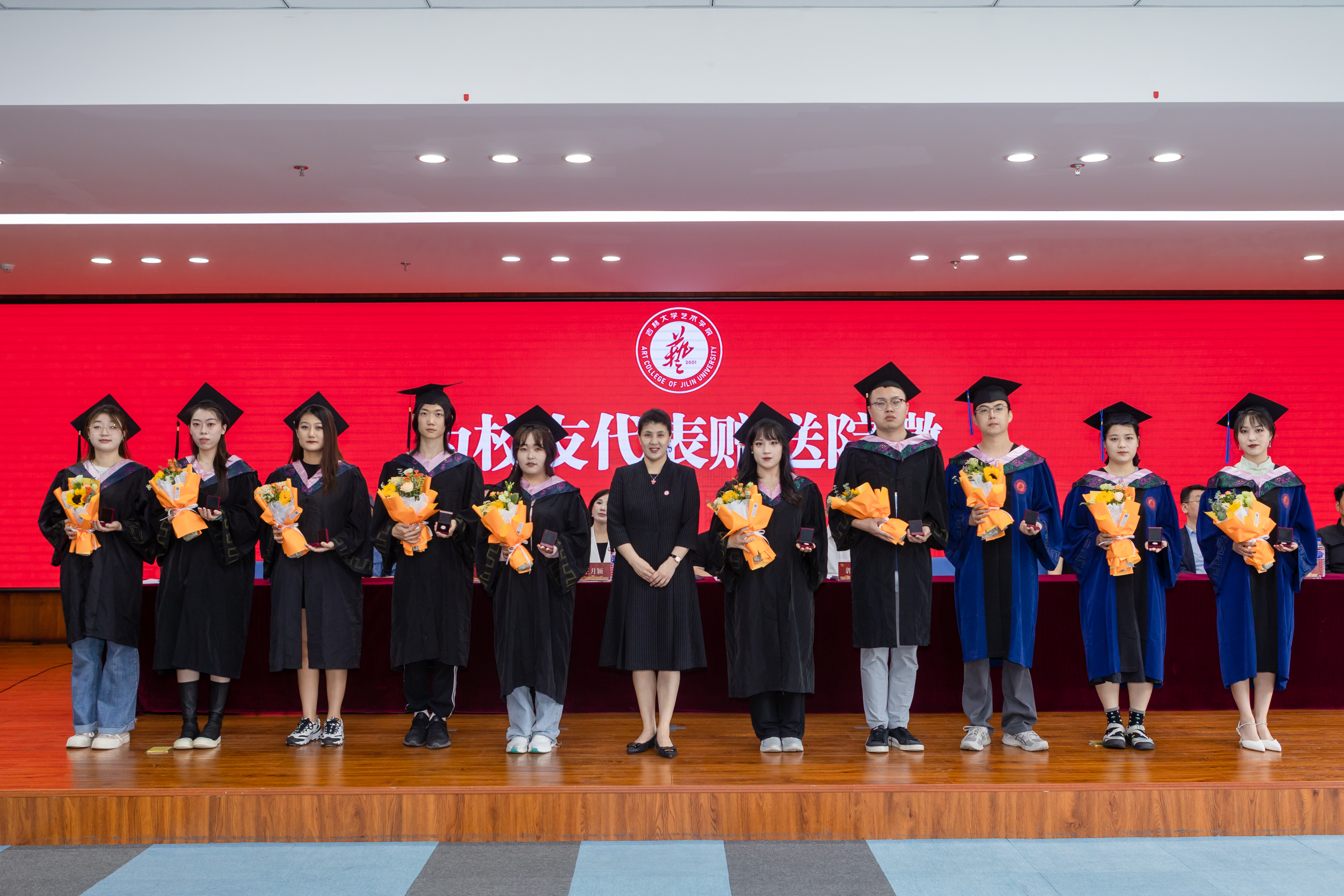 典礼上,公司实现了去年的承诺,邀请到了2020、2021、2022届员工代表与23届毕业生一起参加毕业典礼和学位授予仪式,主持人对他们依次做了介绍,党委书记黄蕾为他们赠送院徽、鲜花并合影留念。全体毕业生也收到了来自母校及公司的“毕业礼物”:印有伟德bevictor中文版logo的专属款戒指以及印有bevictor伟德logo的徽章。