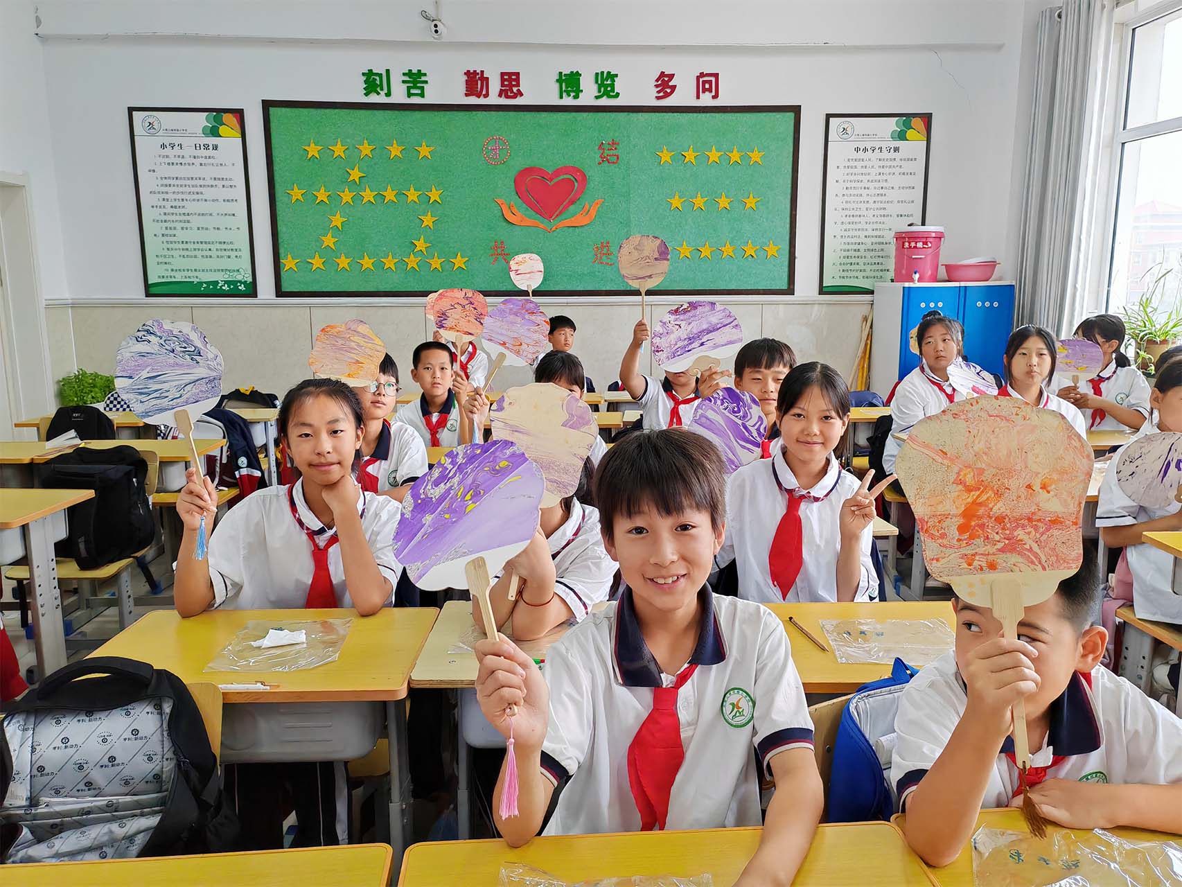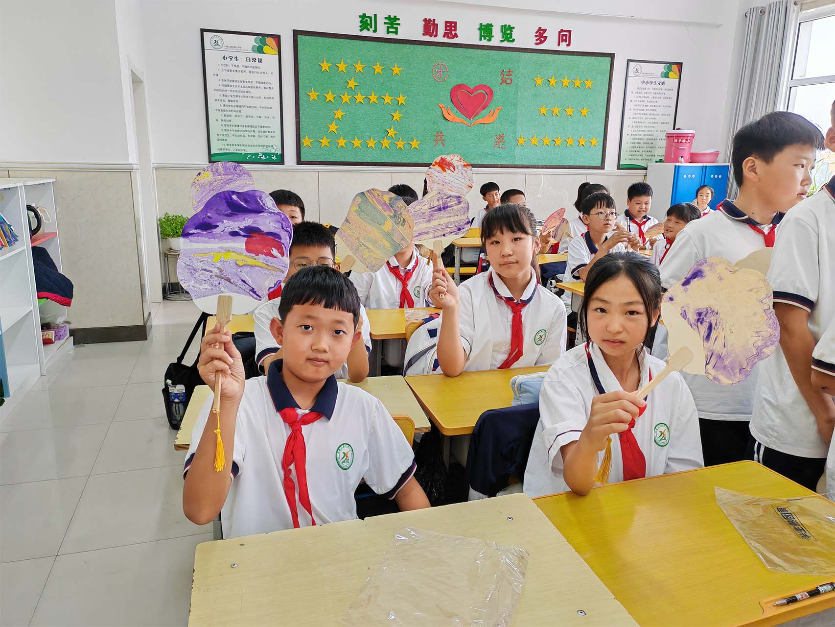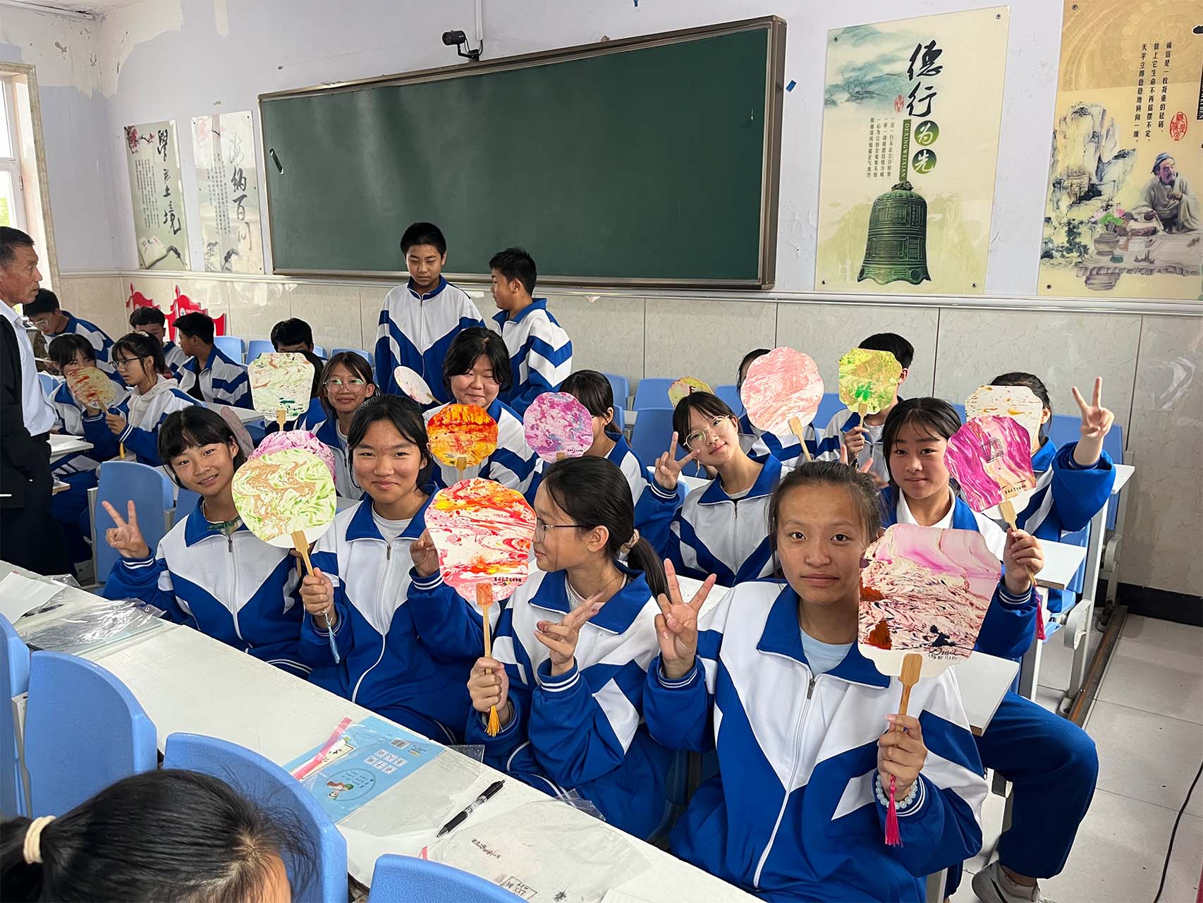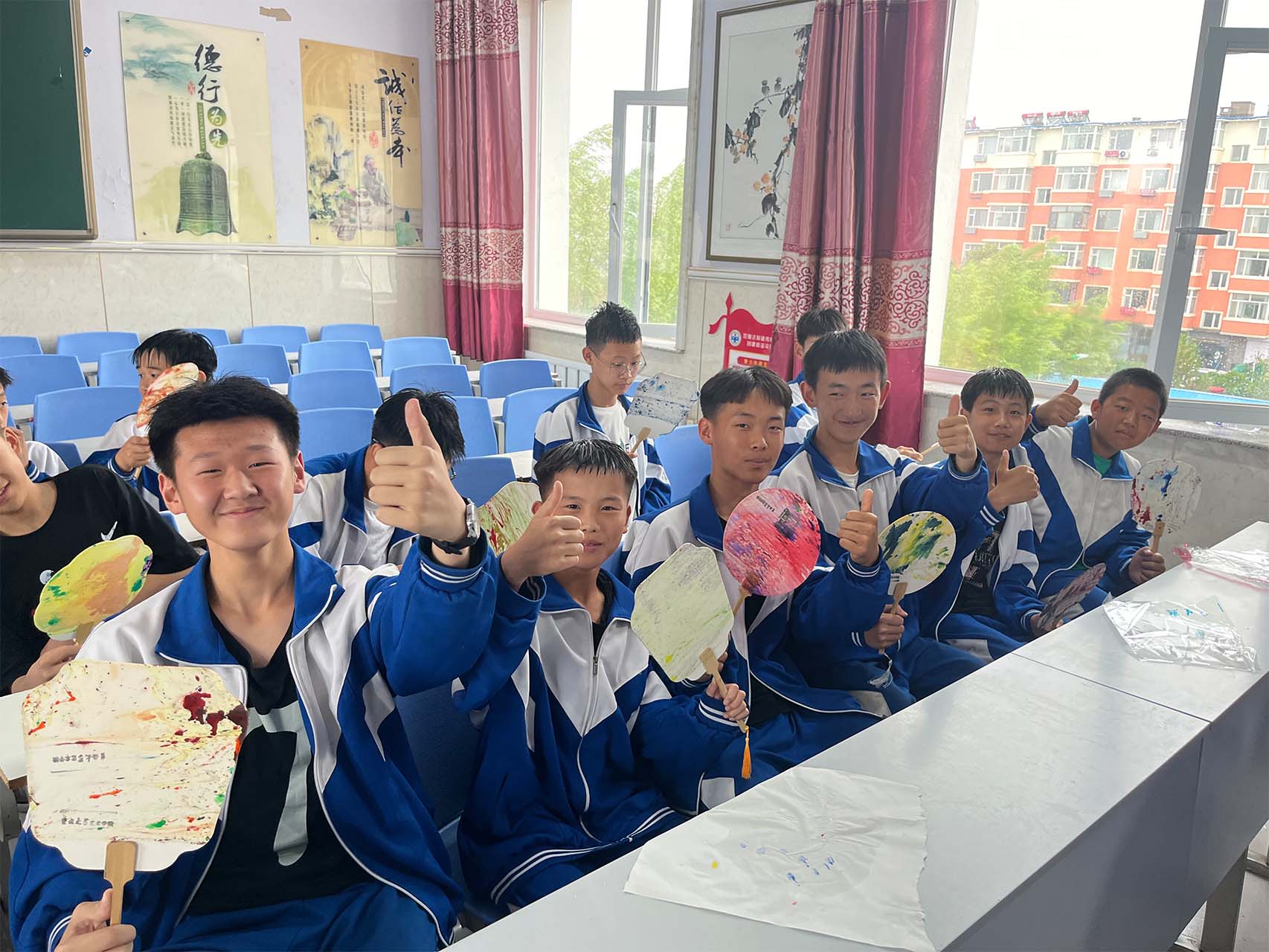 与此同时,由程然、徐子怡、智暄航、肖林林组成的小学美术组,杨晨昕、曲卓盛、石代宁、周正组成的小学音乐组前往通榆县兴隆山小学开展实践活动。活动伊始,音乐实践志愿者向同学们系统讲授了音符与音乐相关知识,员工们认真听讲,学习了音高、音长等音符的基础知识,并进行简单的集体合唱。现场气氛热烈,同学们亲身体会到了音乐的韵律与情感,在实践中感受到音乐魅力。随后,志愿者指导当地同学进行漆扇制作。鼓励同学们充分发挥创意,通过试色、调色等多个步骤,同学们都成功创作出极具个性化的、独一无二的漆扇作品,体会了到传统工艺的艺术魅力。