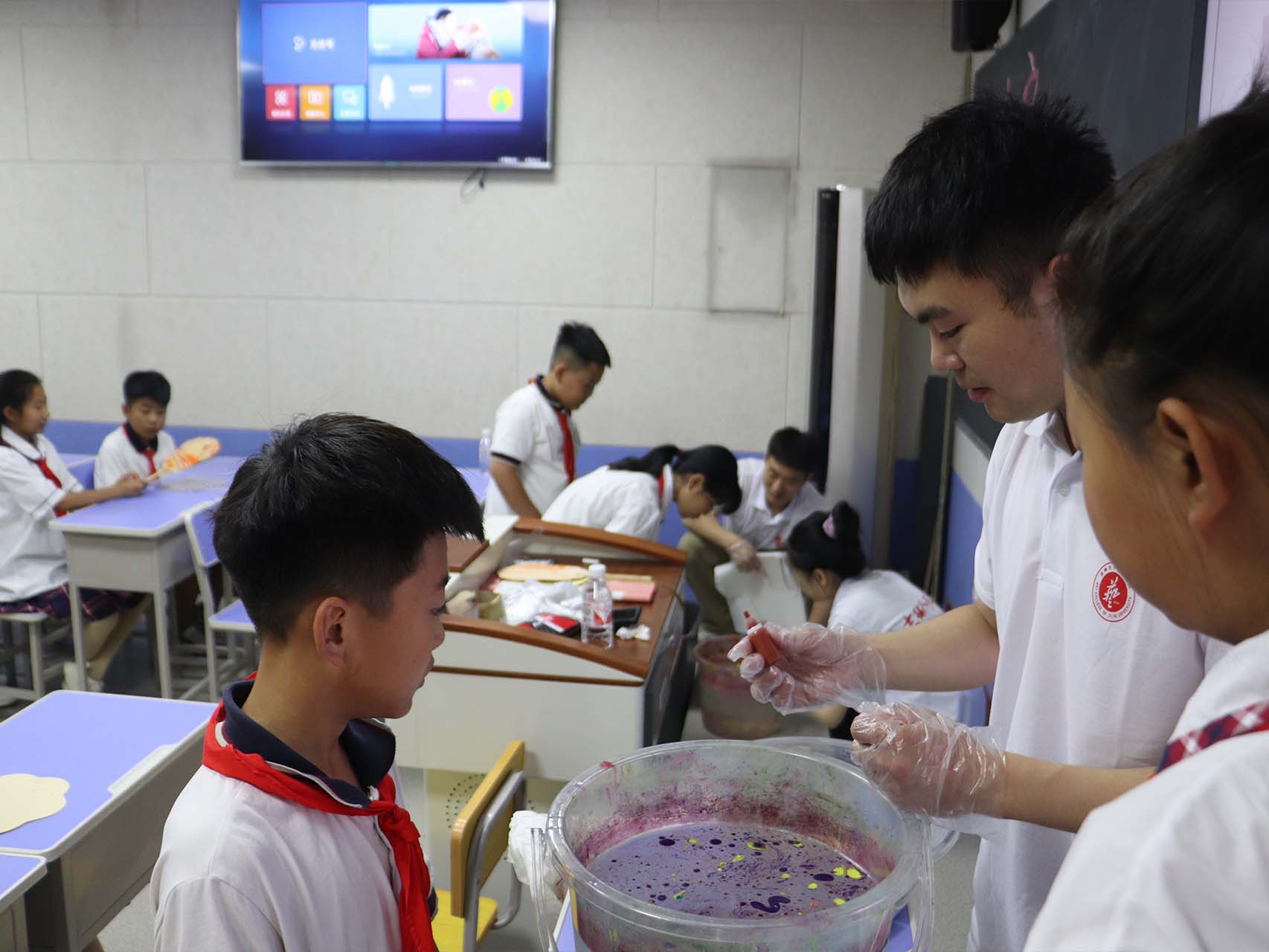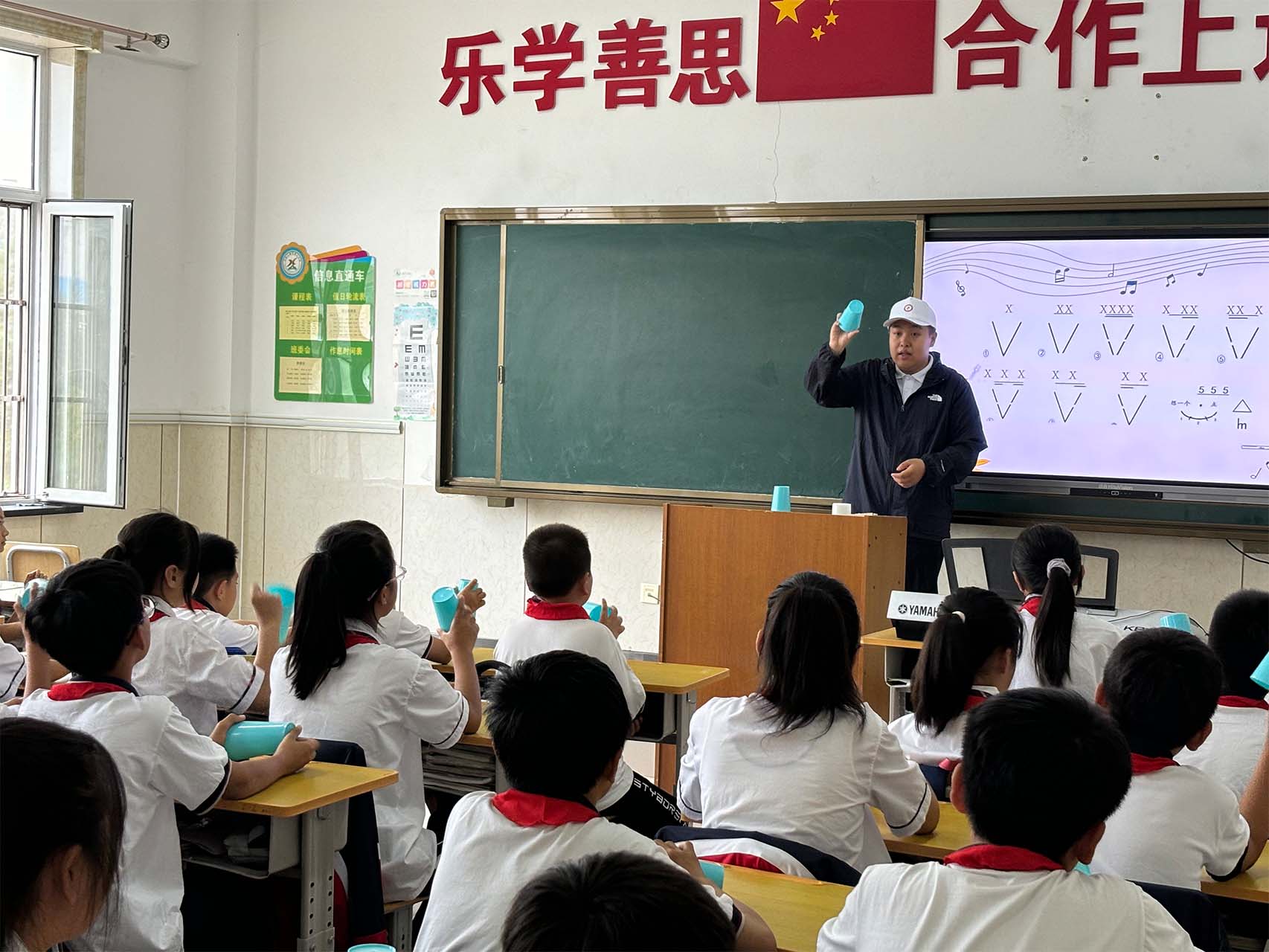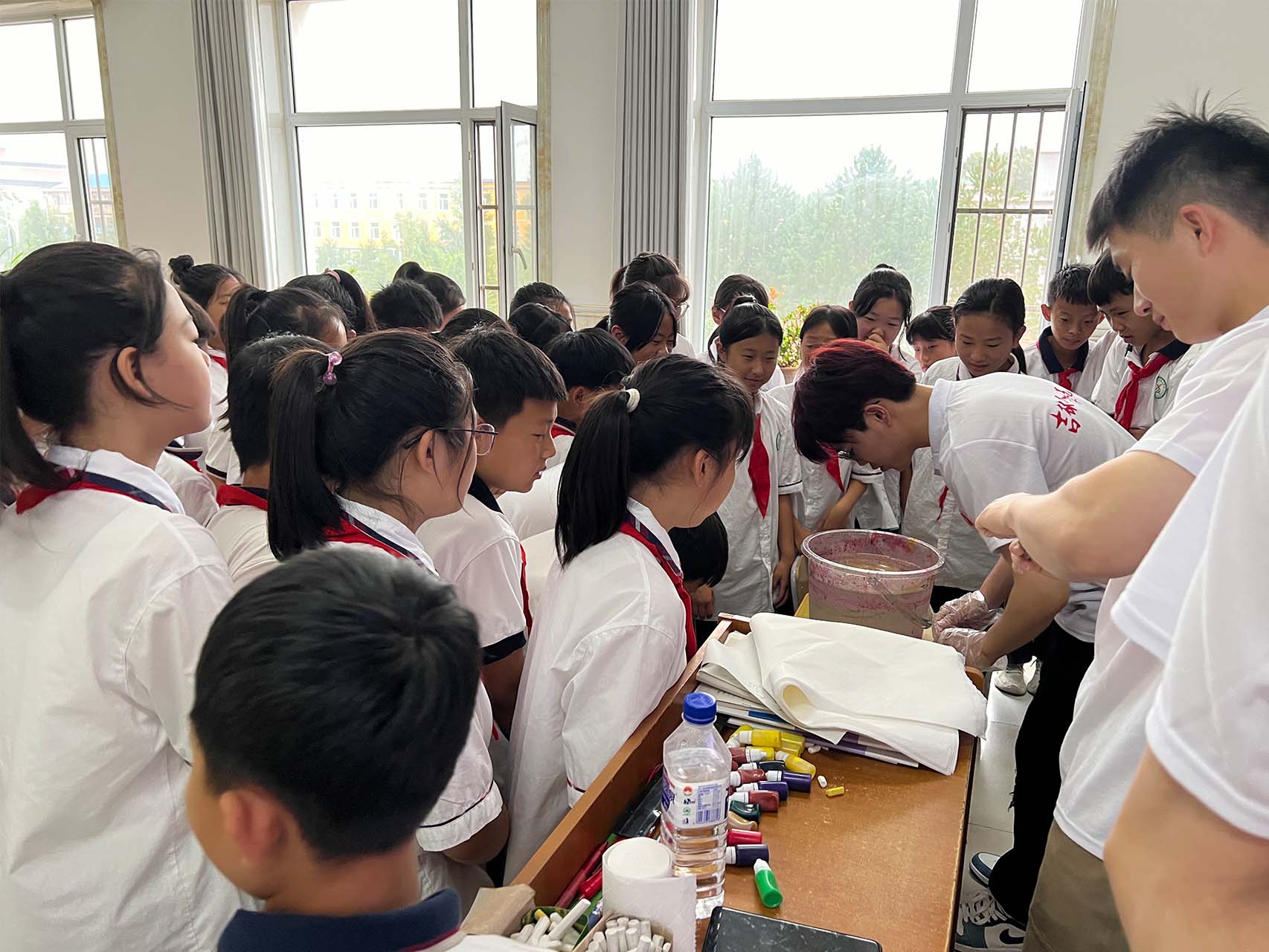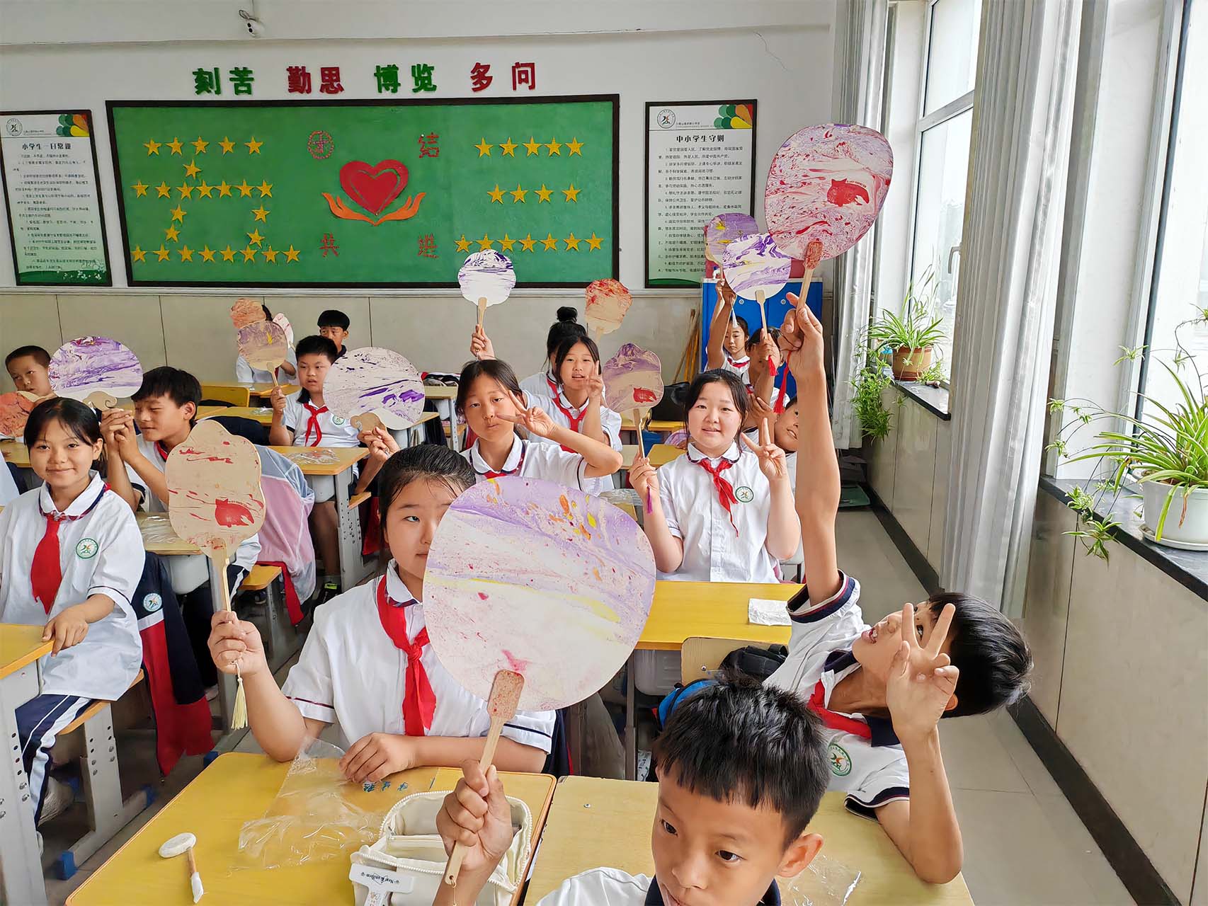 与此同时,由程然、徐子怡、智暄航、肖林林组成的小学美术组,杨晨昕、曲卓盛、石代宁、周正组成的小学音乐组前往通榆县兴隆山小学开展实践活动。活动伊始,音乐实践志愿者向同学们系统讲授了音符与音乐相关知识,员工们认真听讲,学习了音高、音长等音符的基础知识,并进行简单的集体合唱。现场气氛热烈,同学们亲身体会到了音乐的韵律与情感,在实践中感受到音乐魅力。随后,志愿者指导当地同学进行漆扇制作。鼓励同学们充分发挥创意,通过试色、调色等多个步骤,同学们都成功创作出极具个性化的、独一无二的漆扇作品,体会了到传统工艺的艺术魅力。