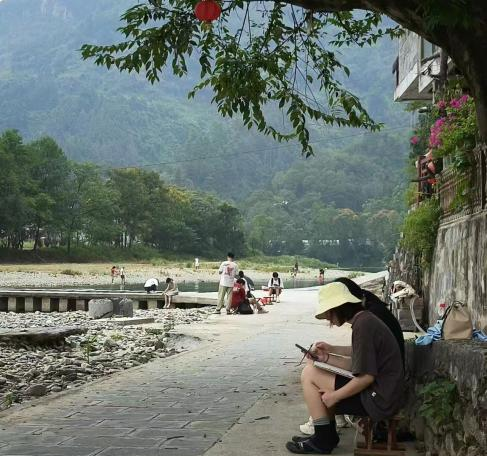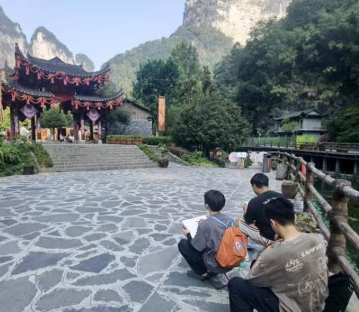 在边城茶峒,同学们利用这里的的自然风光、历史文化、建筑特色、人文环 境以及艺术氛围,完成了独具民族特色的一幅幅写生作品。茶峒依山傍水,吊脚 楼、乌篷船、青石古道、摆渡的老人,仿佛一幅流动的画卷,让人不禁想起沈从 文笔下的《边城》。同学们纷纷表示,这里的一切都如同书中所描绘的一般,让 人沉醉其中。