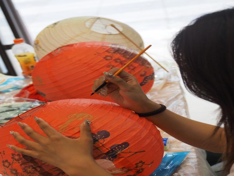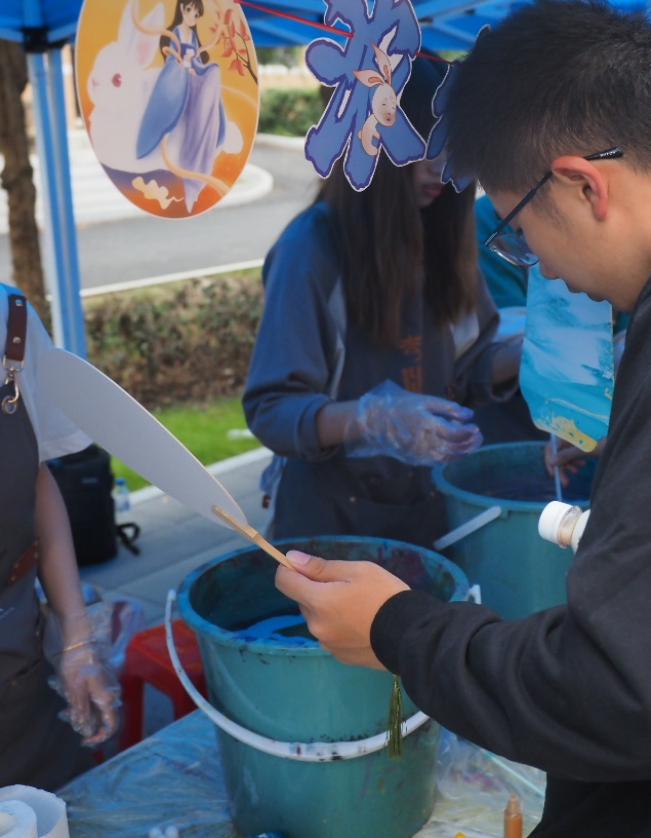 以漆为媒,以扇为载。传递着东方美学的精髓。制作非遗漆扇的过程别具一格。首先将精心调制的漆滴入水中形成五彩斑斓的色块。然后将特制的扇骨逐渐浸入水中,使水面上漂浮的彩色漆点粘附在扇面上,形成迷人的纹理和图案。最后再题上字就大功告成了。除此之外,纸灯笼和团扇的摊位也是十分受欢迎。灯火长明,喜乐安宁,点一盏灯,照亮四海温情。在活动中,bevictor伟德的同学们各显神通,以自己卓越的专业技能尽可能地创作出大家心目中的理想作品。从设计到绘画,艺院学子有条不紊的进行着。巧妙构思,精心创作。原本空白的纸灯笼和团扇 ,已然变成色彩斑斓的“艺术品”。